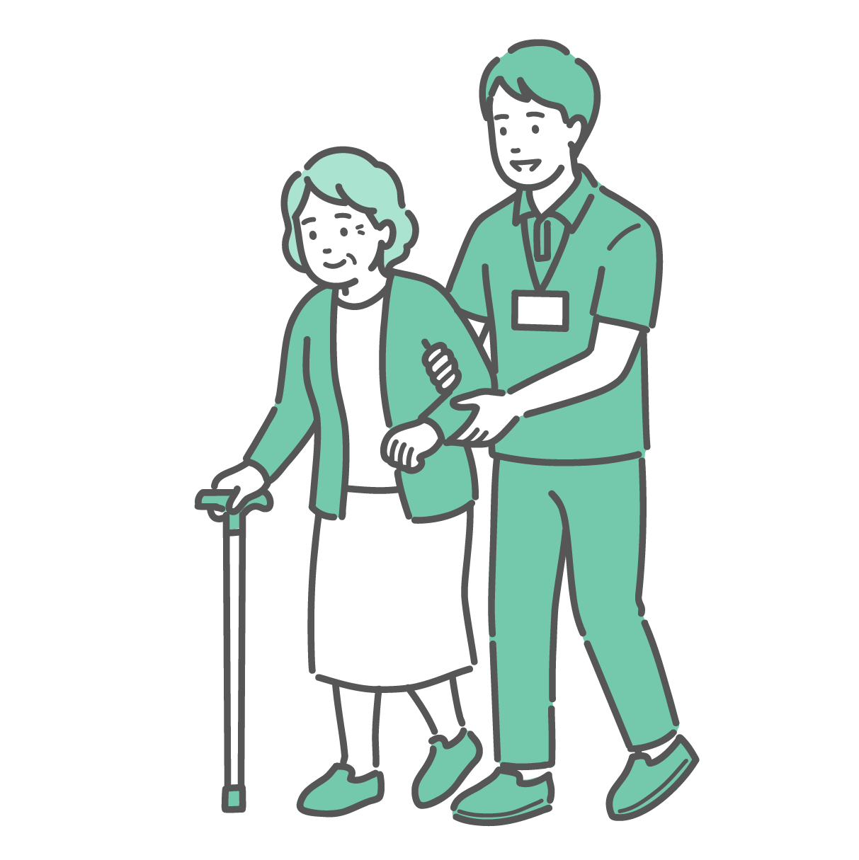 介護・福祉 杖を使った高齢者への歩行介助・移動サポートのイラスト