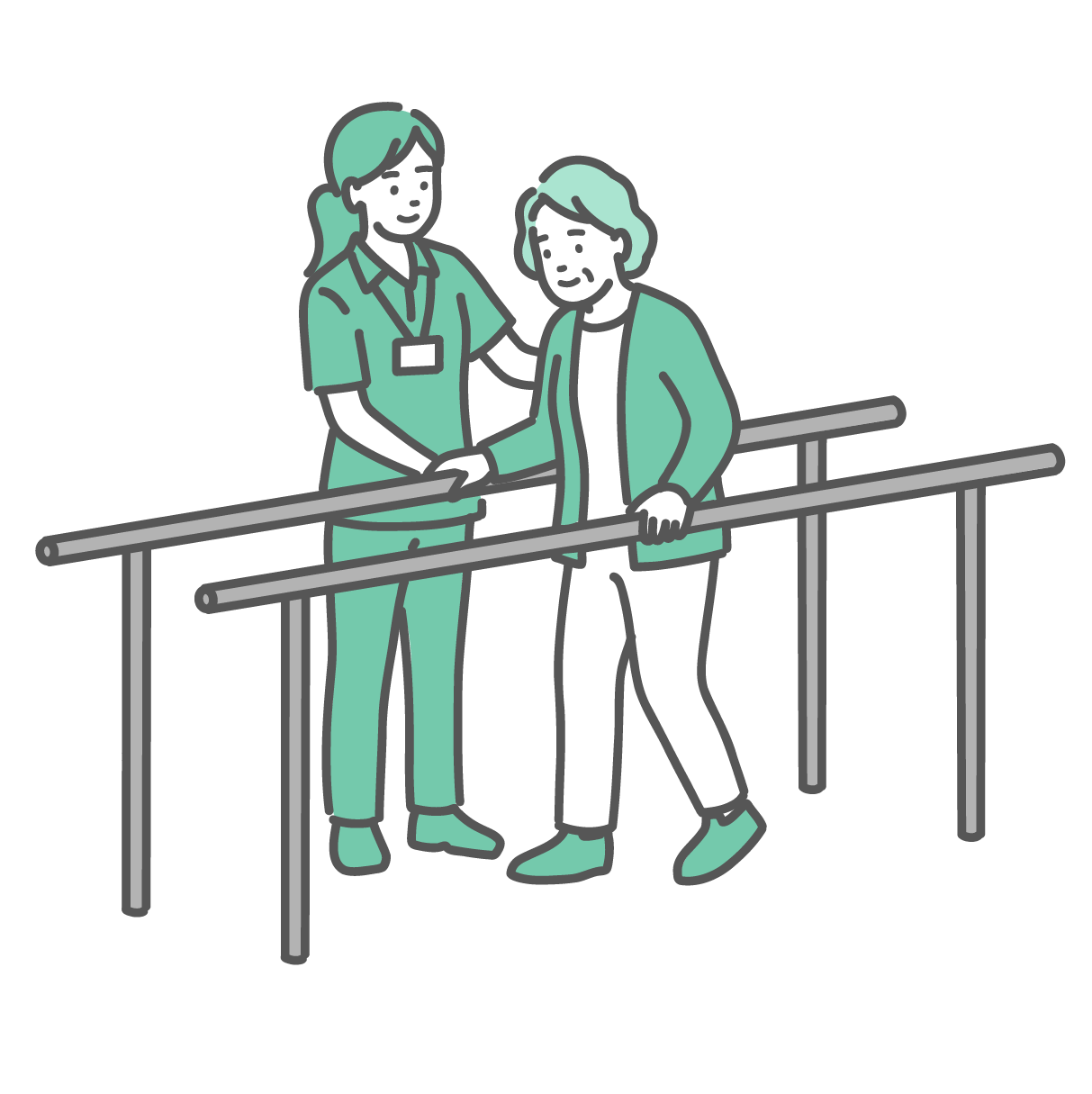 介護・福祉 平行棒を使った歩行訓練・リハビリテーションのイラスト(介護士と高齢者)
