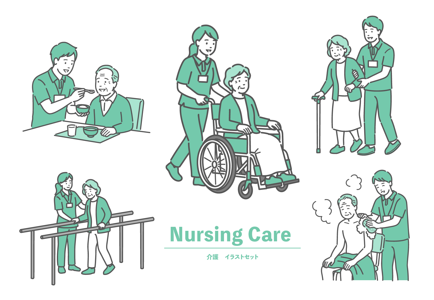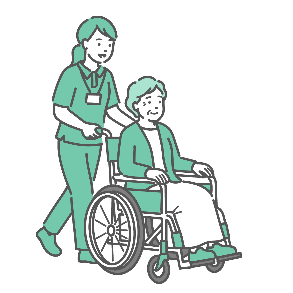 介護・福祉 車椅子に乗った高齢者を移動介助する介護士のイラスト