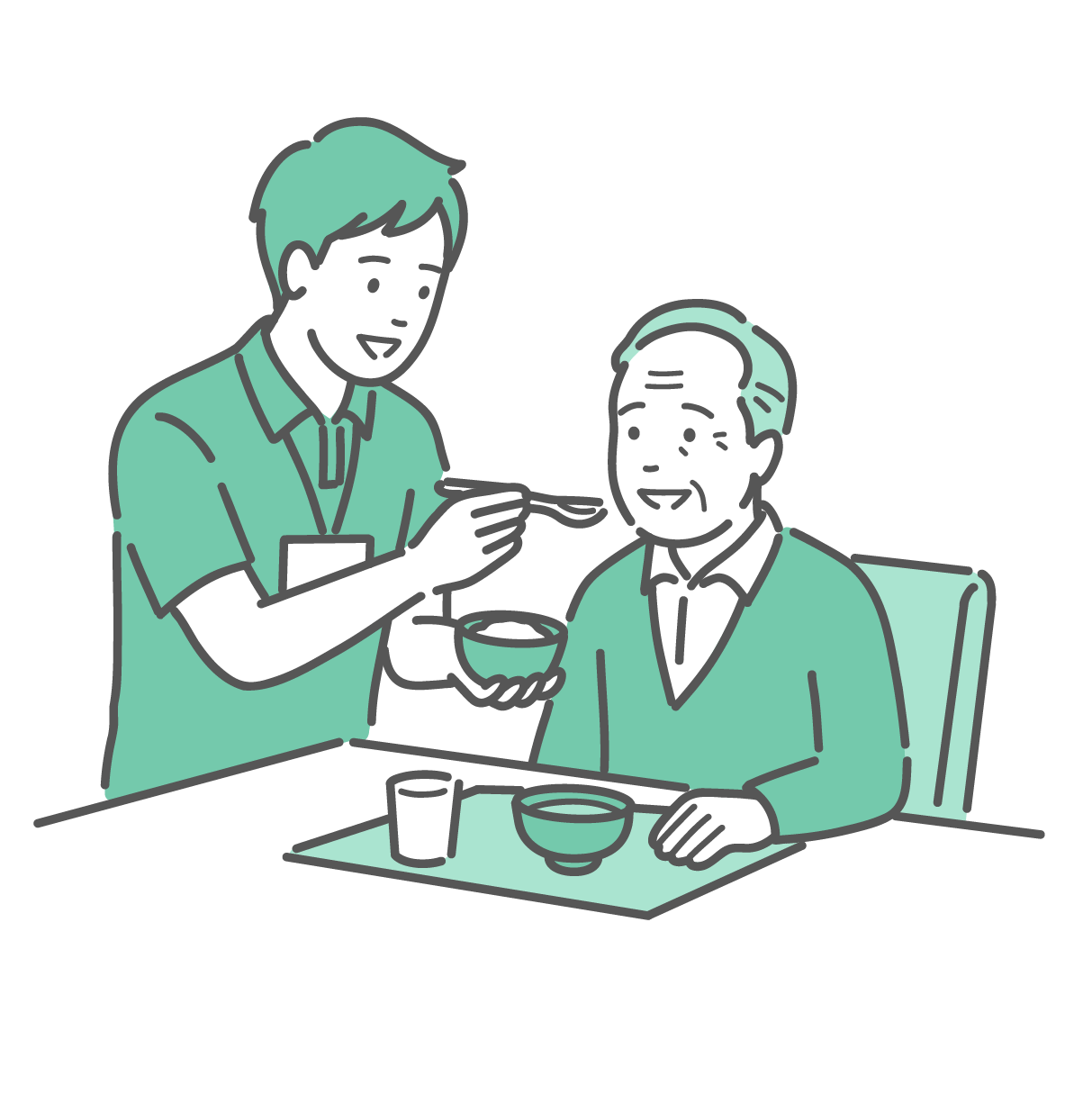 介護・福祉 笑顔で高齢者に食事介助(摂食介助)を行う介護士のイラスト
