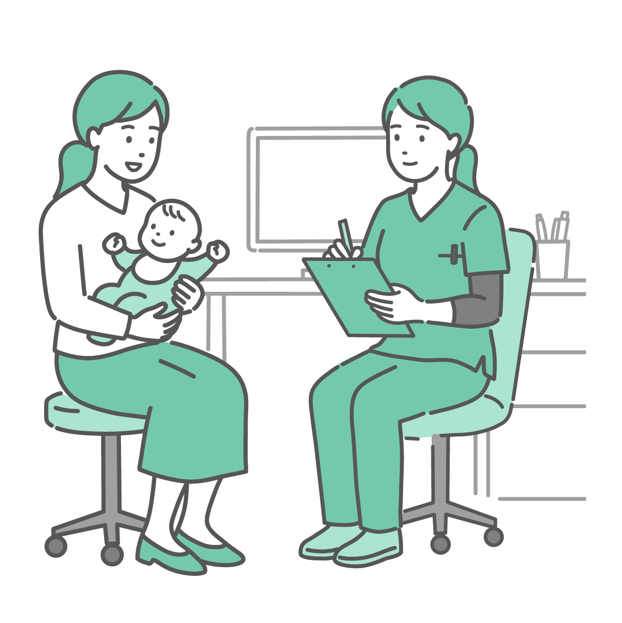 小児科・子供の健康 問診をする女性医師と親子(赤ちゃん・スクラブ・医療従事者)