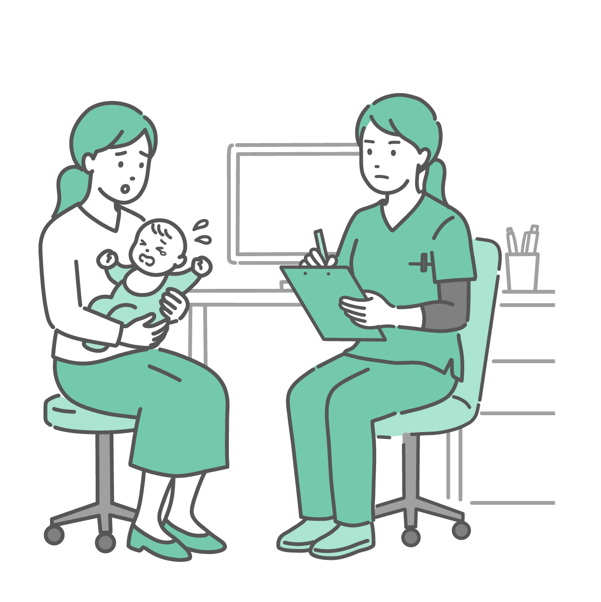 小児科・子供の健康 体調不良を訴える赤ちゃんと母親と女性医師・看護師(スクラブ・救急)