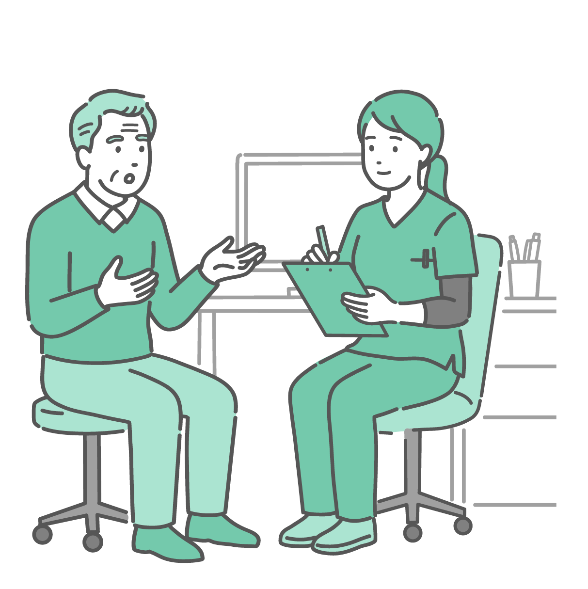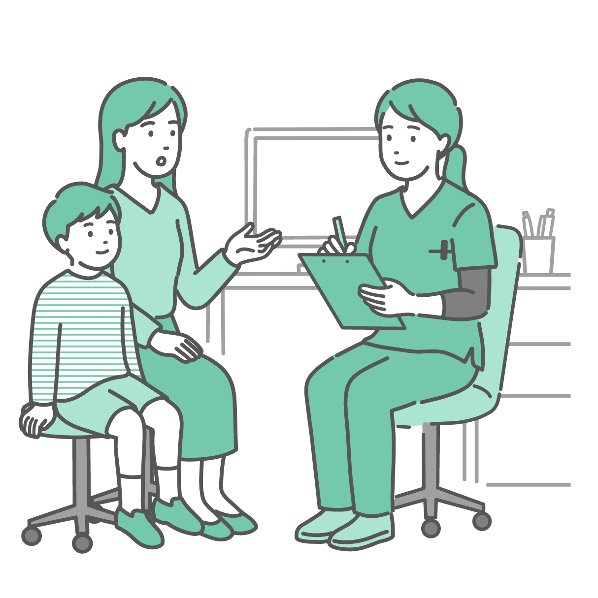 小児科・子供の健康 問診をする女性医師と親子(男の子・スクラブ・医療従事者)