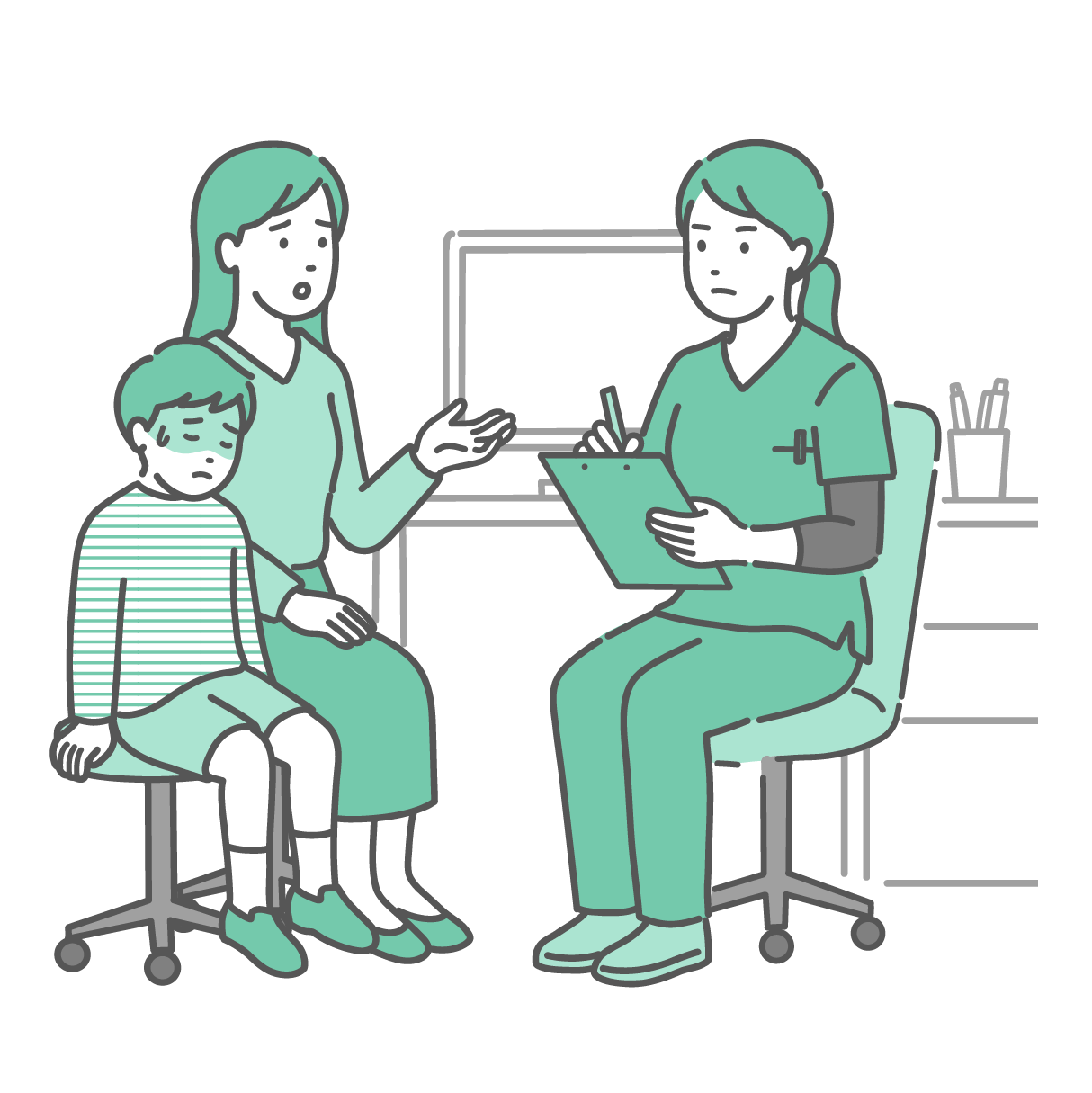 小児科・子供の健康 体調不良を訴える男の子と母親と女性医師・看護師(スクラブ・救急)