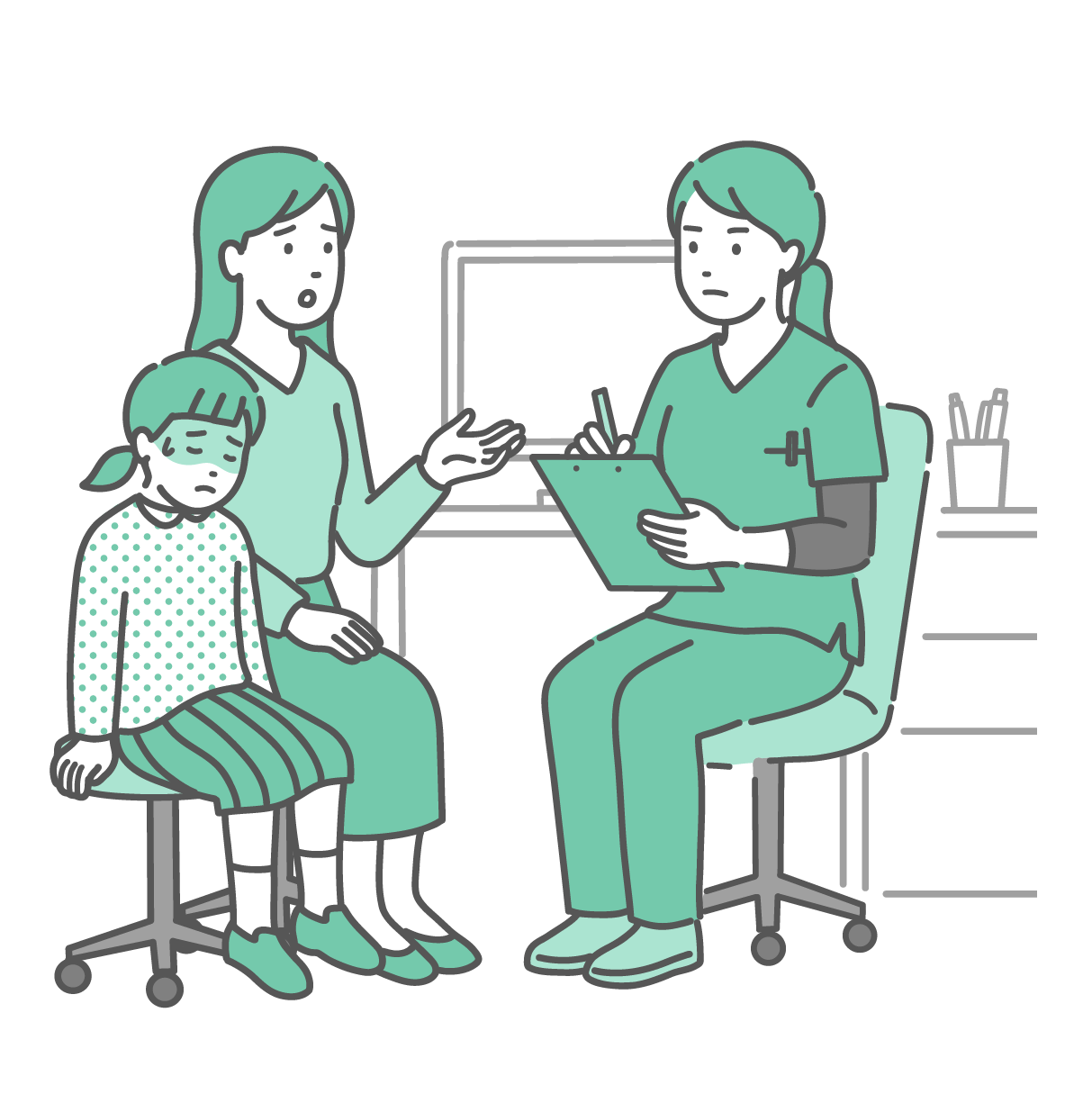 小児科・子供の健康 体調不良を訴える女の子と母親と女性医師・看護師(スクラブ・救急)