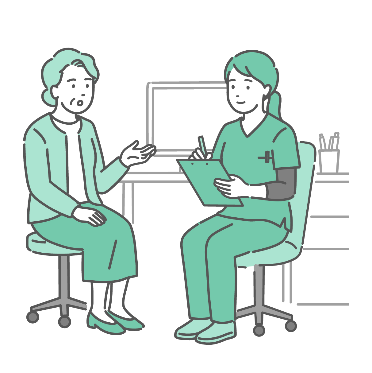 小児科・子供の健康 問診をする女性医師と親子(女の子・スクラブ・医療従事者)