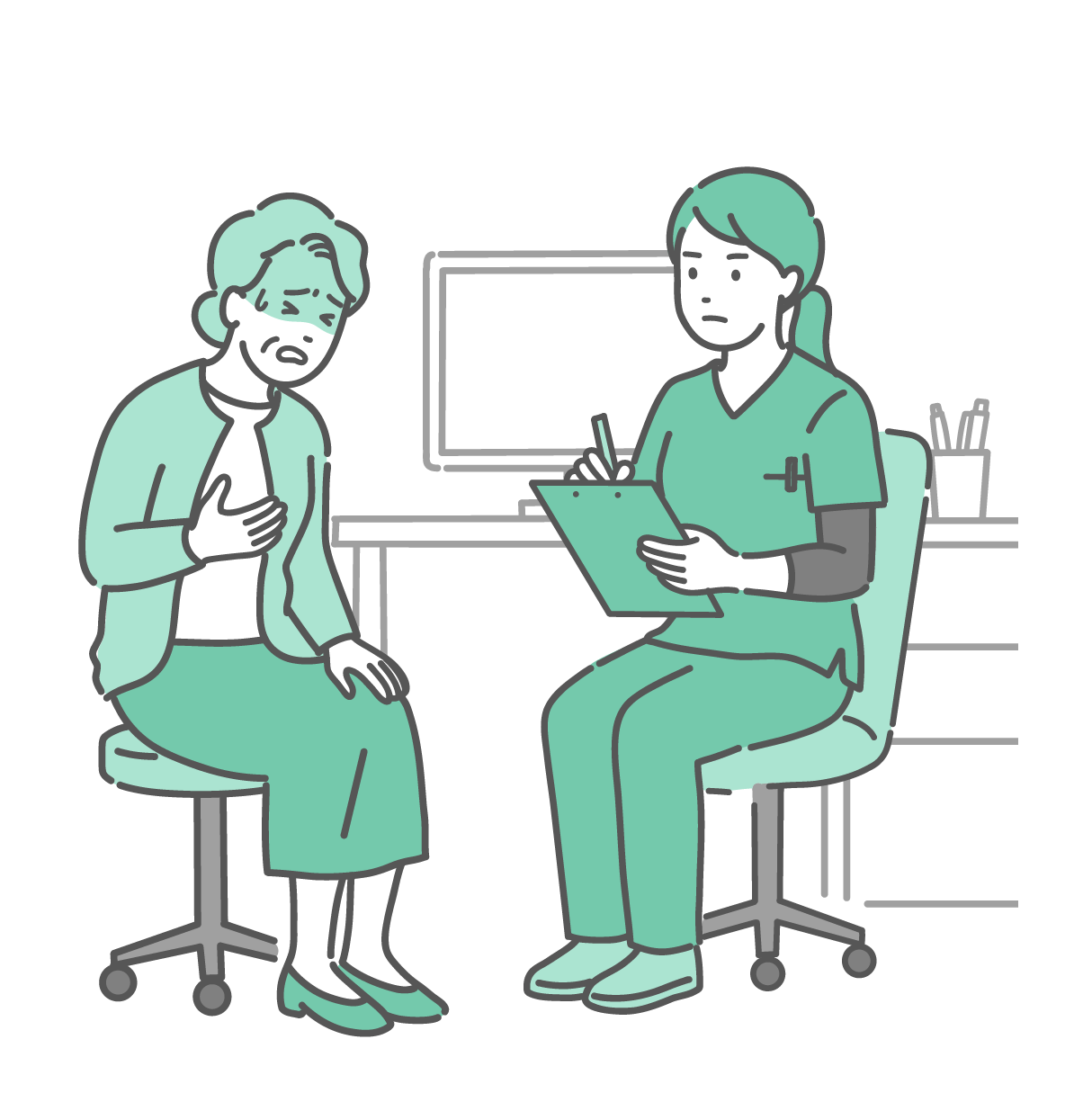 介護・福祉 体調不良を訴える高齢女性と女性医師・看護師(スクラブ・救急)