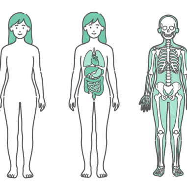 上半身・体幹 表面・内臓・骨格がわかる女性の人体図・全身モデルのイラストセット(正面)
