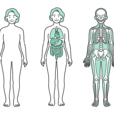 上半身・体幹 表面・内臓・骨格がわかるシニア女性の人体図・全身モデルのイラストセット(正面)
