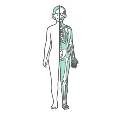 上半身・体幹 表面と骨格の対比がわかるシニア女性の人体図・全身モデルのイラスト(半身骨格・正面)