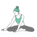 ヨガウェアを着て、あぐら(座位)の姿勢から体を深く前に倒し、前屈ストレッチを行っている女性のイラストです。前屈ストレッチの第3ステップ(完成姿勢)として、背中や腰、股関節をしっかりと伸ばしてリラックスしている状態を表現しています。フィットネスジムの運動指導テキスト、美容・健康コラム、整体院の自宅トレーニング(宅トレ)案内、寝る前のヨガ解説などで使いやすい、シンプルでおしゃれな線画デザインです。