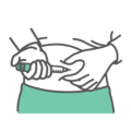 糖尿病治療のインスリン自己注射において、薬液を完全に皮下組織へ注入するために必要な「10秒数える(待機する)」手順を描いたイラストです。 注入ボタンを最後まで押し切った後、すぐに針を抜くと薬液が漏れてしまう可能性があるため、そのままの状態で10秒間待機している様子を視覚的に表現しています。 「10秒」の文字とタイマー風のアイコンを添えており、指導時の重要ポイントが一目で伝わります。 患者指導用パンフレット、看護技術マニュアル、糖尿病教室の資料などに最適です。