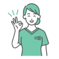緑色のスクラブ(医療用ユニフォーム)を着た、若い女性医療従事者が笑顔でガッツポーズをしている上半身イラストです。患者さんへの応援や激励、「一緒に頑張りましょう」「目標達成」「リハビリ成功」といった前向きなメッセージを伝えるシーンに最適です。女性看護師をはじめ、女医、理学療法士(PT)、歯科衛生士、介護士などのキャラクターとして、クリニックのWebサイトや健康系・美容系ブログの読者のモチベーションを高めるコンテンツで大活躍します。
