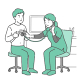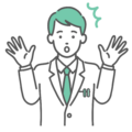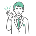 白衣を着た若い男性医師(ドクター)が、笑顔で右手の拳を握りガッツポーズをしている上半身イラストです。「一緒に頑張りましょう」という応援、「治療がうまくいきました」という成功の報告、「数値が良くなりましたね」という達成の喜びなどを表現するシーンに最適です。病院やクリニックのWebサイト、闘病記や健康ブログ、リハビリの応援メッセージなど、前向きで心強いイメージを与えたい場面で使いやすい、清潔感のあるシンプルな線画デザインです。