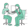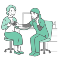 介護・福祉診察室でスクラブ(医療用ユニフォーム)を着た女性医療従事者が、高齢の女性患者(シニア・おばあちゃん)の胸部を聴診しているイラストです。白衣よりも動きやすいスクラブ姿は、訪問診療(在宅医療)や訪問看護、介護老人保健施設(老健)での回診、またはリハビリテーション科での診察シーンなどに最適です。医師だけでなく、看護師による日常的な健康管理(バイタルチェック)の様子としても使いやすい、汎用性の高い一枚です。
