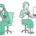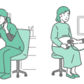 診察室でスクラブ(医療用ユニフォーム)を着た女性医療従事者が、女性患者の胸部を聴診しているイラストの「通常時」と「体調不良時」を並べたバリエーションセットです。左側は定期健康診断や人間ドック、看護師による日常的なバイタルチェックなどの落ち着いたシーン。右側は動悸、息切れ、胸痛、更年期障害によるホットフラッシュ(多汗)、または喘息発作などの自覚症状があり、緊急性や異常が疑われる緊迫したシーンを描いています。健診と病気の比較、受診の目安(症状チェックリスト)、看護師向けのマニュアルなどに便利な一枚です。