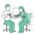 診察室でスクラブ(手術着・医療用ユニフォーム)を着た女性医療従事者が、男性患者の胸部を聴診しているイラストです。白衣よりもカジュアルで威圧感の少ないスクラブ姿は、地域密着型のクリニック、救急外来(ER)、訪問診療、または看護師による予診や特定行為(診療の補助)のシーンに最適です。清潔感があり動きやすい服装のため、リハビリテーション科やスポーツ整形の診察風景としても使いやすい素材です。