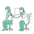 診察室でスクラブ(医療用ユニフォーム)を着た女性医療従事者が、男性患者の胸部を聴診しているイラストの「通常時」と「体調不良時」を並べたバリエーションセットです。左側は職場の定期健康診断や人間ドック、右側は狭心症、心筋梗塞、肺炎などの疾患が疑われる緊迫したシーンを描いています。健診結果の「異常なし」と「要精密検査」の対比や、生活習慣病の悪化による自覚症状(胸痛・冷や汗)の解説、救急受診の目安を伝える資料などに最適な一枚です。