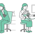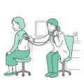 診察室でスクラブ(医療用ユニフォーム)を着た女性医療従事者が、男の子(児童・小学生)の胸部を聴診しているイラストの「通常時」と「体調不良時」を並べたバリエーションセットです。左側は学校での内科検診、水泳前のプール検診、小児科での定期チェックなどの穏やかなシーン。右側は小児喘息の発作、インフルエンザの高熱、肺炎、心雑音の疑いなどが生じている緊迫したシーンを描いています。「こんな症状の時はすぐに病院へ」という啓発資料や、学校保健だよりの素材として非常に使いやすい一枚です。