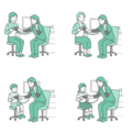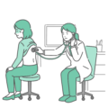 診察室でスクラブ(医療用ユニフォーム)を着た女性医療従事者が、女の子(児童・小学生)の胸部を聴診しているイラストの「通常時」と「体調不良時」を並べたバリエーションセットです。左側は学校での内科検診、水泳前のプール検診、小児科での定期チェックなどの穏やかなシーン。右側は小児喘息の発作、インフルエンザの高熱、肺炎、過呼吸、または心身の不調などが生じている緊迫したシーンを描いています。学校の保健だよりでの「感染症対策」や、小児科クリニックの「受診の目安」解説に最適な一枚です。