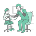 小児科・子供の健康診察室で男性医師が女の子(児童・小学生)の胸部を聴診しているイラストです。小児科での風邪、インフルエンザ、喘息の診察のほか、学校での就学時健康診断、プール前の内科健診などのシーンに最適です。医師はスクラブ姿で、子供もリラックスしており、地域のクリニックや小児医療の案内、学校保健だよりの挿絵として使いやすい素材です。
