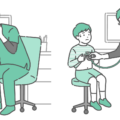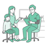 小児科・子供の健康診察室で男性医師が乳児(赤ちゃん)の胸部を聴診しているイラストの「通常時(笑顔)」と「異常時(泣き顔)」を並べたバリエーションセットです。左側は定期健診や予防接種の予診などの落ち着いたシーン、右側は発熱・感染症による不機嫌、人見知り、注射での恐怖、または体調不良を訴えている緊迫したシーンを描いています。健診と病気の比較、予防接種のビフォーアフター、子供の受診ガイドなどに便利な一枚です。