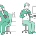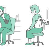 診察室で男性医師が高齢の女性患者(シニア)の胸部を聴診しているイラストの「通常時」と「体調不良時」を並べたバリエーションセットです。左側は定期検診や高血圧の管理などの落ち着いたシーン、右側は心不全、誤嚥性肺炎、不整脈などの自覚症状がある場合や、急変時の緊迫したシーンを描いています。症状の有無による比較解説、ビフォーアフター、正常と異常の対比図などに便利な一枚です。