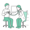診察室でスクラブを着用した男性医師が、様々な年齢・性別の患者を聴診しているイラストのコンプリートセット(通常時・健康)です。成人男女、高齢者(おじいちゃん・おばあちゃん)、小児(赤ちゃん・男の子・女の子)、妊婦の計8パターンを一覧にしています。地域医療、ファミリークリニック、総合病院など、幅広い年齢層を受け入れる医療機関のホームページや、診療案内のパンフレットなどで「誰でも受診できます」というイメージを伝えるのに最適な素材です。