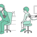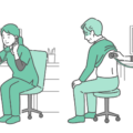 診察室でスクラブを着用した女性医療従事者(医師、看護師)が、母親に抱かれた赤ちゃん(乳児)の背部(背中)に聴診器を当てて診察しているイラストの「通常時」と「体調不良時」を並べたバリエーションセットです。左側は乳児健診や予防接種前のチェック、右側はRSウイルス感染症、細気管支炎、肺炎などで機嫌が悪く泣いている緊急性の高いシーンを描いています。「普段の様子との違い」や「ぐったりしている時のサイン」を対比させて解説する育児書、小児科クリニックのHP、母子手帳の副読本などに最適な一枚です。
