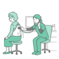 診察室でスクラブを着用した女性医療従事者(医師、看護師、理学療法士など)が、高齢男性(おじいさん)の背部(背中)に聴診器を当てて診察しているイラストです。動きやすいスクラブ姿は、病院だけでなく、訪問診療、訪問看護ステーション、介護施設での日常的な健康チェックのシーンに最適です。高齢者に多い誤嚥性肺炎の早期発見、COPD(慢性閉塞性肺疾患)の管理、心不全の兆候確認など、地域医療や在宅ケアをテーマにした資料で使いやすい一枚です。
