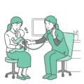 季節・アレルギー症状診察室でスクラブを着用した女性医療従事者(医師、看護師)が、男の子(児童)の背部(背中)に聴診器を当てて診察をしているイラストです。1人で椅子に座れる年齢のお子さんを描いているため、小児科での通常の風邪診察はもちろん、小学校の健康診断、就学時健診、喘息の定期チェック、アレルギー科での受診など、幅広い小児医療のシーンに対応します。スクラブ姿の医療者は親しみやすく、子供が怖がらない「優しい小児科」のイメージ作りに最適です。