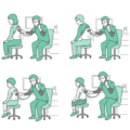 診察室でスクラブ(医療用ユニフォーム)を着用した男性医師が、妊婦(妊娠中の女性)の背部(背中)に聴診器を当てて診察をしているイラストの「通常時」と「体調不良時」を並べたバリエーションセットです。左側は定期的な妊婦健診やマイナートラブルの相談、右側は妊娠性喘息の悪化、周産期心筋症、肺塞栓症(エコノミークラス症候群)、重症肺炎などで苦しんでいる緊急性の高いシーンを描いています。「妊娠中の息切れ、こんな時は病院へ」といった啓発資料や、母体救急時の対応マニュアルなどに最適な一枚です。