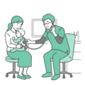 季節・アレルギー症状診察室でスクラブ(手術着・医療用ユニフォーム)を着用した男性医師が、泣いている赤ちゃんの背部(背中)に聴診器を当てて診察しているイラストです。赤ちゃんは涙を流してぐずっており、母親も心配そうに抱きかかえています。医師も真剣かつ少し困った表情をしており、高熱が出た際の受診、夜間救急外来、あるいは単に病院嫌いで泣いてしまう子供の描写など、小児科医療のリアルな一場面として幅広く活用できます。