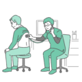 診察室でスクラブ(医療用ユニフォーム)を着用した男性医師が、高齢女性(おばあさん)の背部(背中)に聴診器を当てて診察をしているイラストの「通常時」と「体調不良時」を並べたバリエーションセットです。左側は定期的な訪問診療や健康チェック、右側は誤嚥性肺炎の疑い、慢性心不全の悪化、COPD(慢性閉塞性肺疾患)の発作などで苦しんでいる緊急性の高いシーンを描いています。「普段と呼吸音が違う」といった介護現場での気付きを促す資料や、医療連携の重要性を説くパンフレットなどに最適な一枚です。