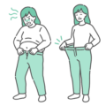 ダイエット・美容太ってズボンがきつい高齢女性(ビフォー)と、ダイエットに成功してズボンがブカブカになった高齢女性(アフター)の比較イラストセットです。 シニア層のメタボリックシンドローム改善、健康診断の結果改善、膝や腰への負担軽減(変形性膝関節症対策)のイメージとして最適です。 健康食品(青汁やグルコサミンなど)の広告、シニア向けフィットネスや体操教室のチラシ、介護予防の啓発素材として幅広くご利用いただけます。