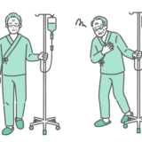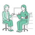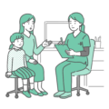 診察室で、体調不良でぐったりしている女の子(幼児~小学生)を連れた母親が症状を訴えている、スクラブ(医療用ユニフォーム)を着用した女性医療従事者のイラストです。 女の子が冷や汗をかき顔色が悪い様子を描いており、高熱を出した際の「発熱外来」や、インフルエンザ・プール熱などの「学校感染症」、あるいは腹痛や怪我による「救急外来(ER)」の受診シーンに最適です。 看護師によるトリアージ(緊急度判定)や、医師による入院判断の説明、または「こんな症状の時はすぐに病院へ」といった啓発記事の挿絵として幅広くご利用いただけます。