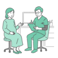 診察室で、体調不良でぐったりしている女の子(幼児~小学生)とお母さんを診察している、スクラブ(手術着・医療用ユニフォーム)を着用した男性医師のイラストです。 急な高熱や激しい腹痛(虫垂炎・胃腸炎)、あるいは学校や野外活動での「怪我」「熱中症」など、緊急性が高い小児科受診のシーンとして最適です。 医師が動きやすいスクラブ姿であることから、救急外来でのトリアージや、インフルエンザ・プール熱等の感染症流行時の対応、夜間診療の案内などを解説する医療記事のアイキャッチ画像として幅広くご利用いただけます。