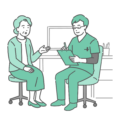 診察室で、胸の痛みや息苦しさ、冷や汗などの急性症状を訴えている女性患者と、それを診察するスクラブ(手術着・医療用ユニフォーム)を着用した男性医師のイラストです。 「狭心症」「心筋梗塞」などの循環器疾患や、女性に多い「更年期障害(動悸・発汗)」、あるいは「パニック障害」や「過呼吸」の受診シーンとして最適です。 医師が動きやすいスクラブを着用しているため、救急外来(ER)での初期対応や、検査・処置が必要な切迫した状況を説明する医療記事のアイキャッチ画像として幅広くご利用いただけます。