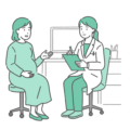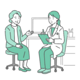 診察室で、体調不良や不安を訴えている妊婦(プレママ)と、それを診察する女性医師(産婦人科医)のイラストです。 妊婦は冷や汗をかき、お腹をさすりながら苦しそうな表情をしており、緊急性や強い不調を感じさせるシーンです。 ひどいつわり(妊娠悪阻)、お腹の張り、腹痛、切迫早産の兆候、あるいは陣痛の始まりといった妊娠中のトラブルのイメージに最適です。 また、妊娠高血圧症候群などの合併症や、マタニティブルーなどの妊娠中の不安相談、出産前の体調急変時の対応マニュアルなどにもご利用いただけます。
