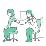 検査・測定診察室で、深刻な体調不良や痛みを訴えている男性患者と、それを診察する女性医師のイラストです。 患者は冷や汗をかき、胸のあたりに手を当てて苦悶の表情を浮かべており、緊急性のある症状や強い不安を感じている様子を描いています。 風邪や発熱などの内科的症状はもちろん、動悸・息切れ・胸痛といった循環器系の疾患、あるいはパニック障害や強い不安感の相談など、幅広い「病状の訴え」のシーンでご利用いただけます。