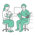 診察室で、体調不良で泣いている赤ちゃん(乳児)とお母さんを診察している、スクラブ(手術着・医療用ユニフォーム)を着用した男性医師のイラストです。 急な発熱や感染症(RSウイルス・インフルエンザ等)の疑い、あるいは夜泣きや誤飲などの「小児救急」での受診シーンとして最適です。 医師が動きやすいスクラブ姿であることから、夜間・休日診療所での対応や、処置が必要な緊急性の高い症状を解説する医療記事のアイキャッチ画像として幅広くご利用いただけます。
