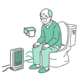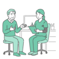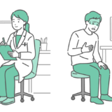 診察室で、深刻な体調不良や痛みを訴えている高齢の女性患者(シニア)と、それを診察するスクラブ姿の女性医療従事者(医師・看護師)のイラストです。 患者は冷や汗をかき、胸を押さえて苦悶の表情を浮かべており、狭心症や心筋梗塞、あるいは熱中症やヒートショックといった緊急性のある症状を描いています。 総合病院の救急外来(ER)はもちろん、介護老人保健施設(老健)や特別養護老人ホームでの「入居者の急変対応」、看護師によるトリアージ、ご家族への緊急連絡のイメージ画像などに最適です。