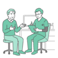 診察室で、胸の痛みや息苦しさ、冷や汗などの深刻な体調不良を訴えている高齢の女性患者(シニア)と、それを診察するスクラブ(手術着・医療用ユニフォーム)を着用した男性医師のイラストです。 高齢者に多い「狭心症」「心筋梗塞」などの循環器疾患や、「心不全」による呼吸苦、あるいは夏場の「熱中症」や「脱水症状」の受診シーンとして最適です。 医師が動きやすいスクラブ姿であることから、救急搬送後の初療室での対応や、訪問診療における緊急時のトリアージなどを解説する資料のイメージ画像として幅広くご利用いただけます。