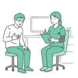 診察室で、深刻な体調不良や痛みを訴えている高齢の男性患者(シニア)と、それを診察する女性医師のイラストです。 患者は冷や汗をかき、胸のあたりに手を当てて苦悶の表情を浮かべており、緊急性のある症状や不安を感じている様子を描いています。 狭心症、心筋梗塞、心不全といった循環器系の疾患や、COPD(慢性閉塞性肺疾患)による息切れ、高血圧発作などのイメージ画像に最適です。 また、高齢者のヒートショック事故や、介護現場での体調急変時の対応マニュアルなどにもご利用いただけます。