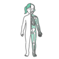 女の子(子供・幼児)の全身(正面)のシルエットに、主要な内臓(肺、心臓、肝臓、胃、小腸、大腸など)を描き込んだ人体図モデルのイラストです。小児科での消化器系(お腹の風邪、胃腸炎など)や呼吸器系の病気の解説、子供の体の仕組み(食育や健康教育)を説明する図解ベース素材として非常に重宝します。クリーンな線画デザインのため、痛む部位に矢印や赤丸を追加しやすく、小児医療や育児系ブログでの汎用性が抜群です。