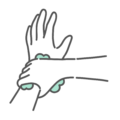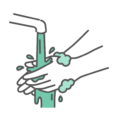 正しい手洗いの手順における**「指の間(指間)」の洗浄**ステップを示すイラストです。この部分は洗い残しが多く、細菌が残りやすいため、この工程の重要性を強調する資料に最適です。感染症対策マニュアル、健康教育、病院・介護施設での指導資料でご利用いただけます。