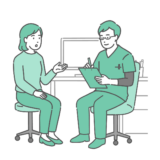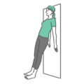 ダイエット・美容壁に背中をつけて立ち、**正しい立ち姿勢(ニュートラルポジション)**を確認しているイラストです。体幹安定、姿勢改善、リハビリ、肩甲骨ストレッチの開始姿勢など、幅広い運動・健康指導の資料にご利用いただけます。