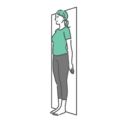 ダイエット・美容壁に背中をつけて行う肩甲骨と胸のストレッチの連続動作(2ステップ)イラストです。肩こり、猫背、姿勢の改善を目的とした運動指導や解説資料にご利用いただけます。肩甲骨周りの筋肉をほぐし、上半身のリラックスに繋がります。