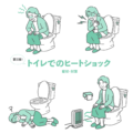 介護・福祉高齢者のヒートショックの危険性と対策を一枚にまとめたセット素材です。「排便時の強いいきみによる急激な血圧上昇」「胸の痛み・発作(心筋梗塞・脳卒中の前兆)」「意識消失・転倒事故」という危険な流れと、「ヒーター設置による予防策」を対比させています。冬場のトイレ卒中予防、介護現場でのリスク管理、家族への注意喚起の資料に最適です。