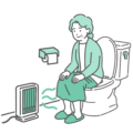 介護・福祉冬場のトイレにおけるヒートショック対策のイラスト素材です。急激な温度変化による血圧の乱高下は、高齢者にとって脳卒中や心筋梗塞のリスクとなるため、足元に暖房器具(セラミックヒーターなど)を設置して空間を暖めている様子を描いています。冬の健康管理、介護予防、住環境の整備などの資料に最適です。